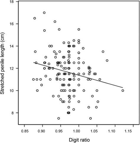 The relationship between digit ratio and stretched penile length. Stretched penile length was found to be negatively assoc-iated with digit ratio. y 5 29.201 x 1 20.577 ( r 5 20.216, P 5 0.009) ( y : stretched penile length, x : digit ratio) See pages 710-714 for details.